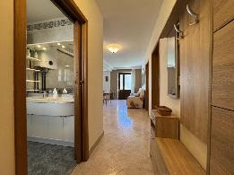 Entrando il corridoio vi condurrà al luminoso soggiorno, arredato con gusto in stile moderno, la cucina con penisola ben attrezzata, e un caldo salottino, impreziosito da una moderna stufa.